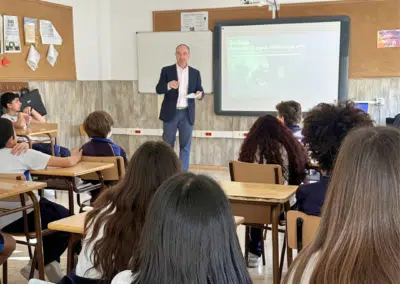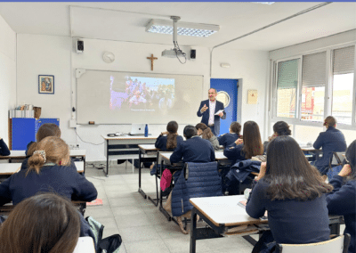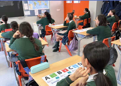 En primer lugar, el 11 de marzo visitamos el Colegio Santo Ángel de la Guarda y compartimos dos sesiones con 50 estudiantes (25 niños y 25 niñas) de 1º de la ESO.