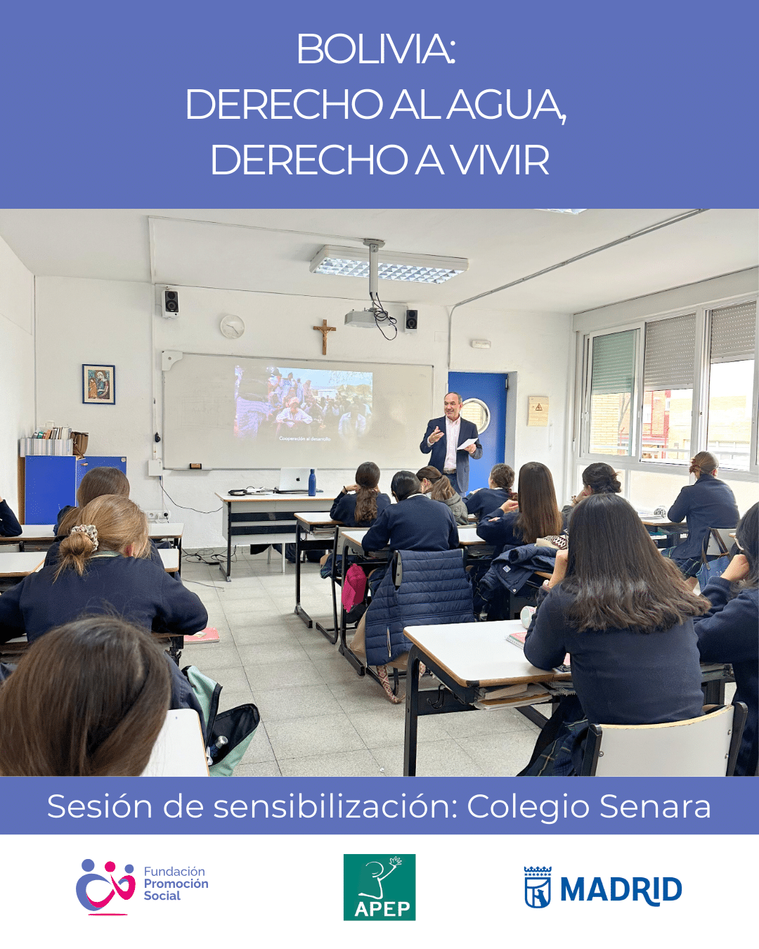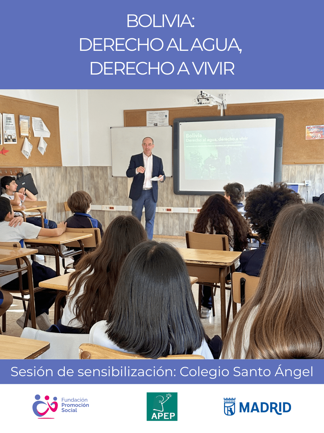 Este mes de marzo, hemos visitado tres colegios de Madrid para impartir las sesiones de sensibilización «Bolivia: Derecho al agua, derecho a vivir». Esta iniciativa se ha organizado en el marco del proyecto que desarrollamos en Bolivia, con APEP y el apoyo financiero del Ayuntamiento de Madrid, para promover el acceso al agua potable y el saneamiento en la comunidad rural indígena de El Carmen.