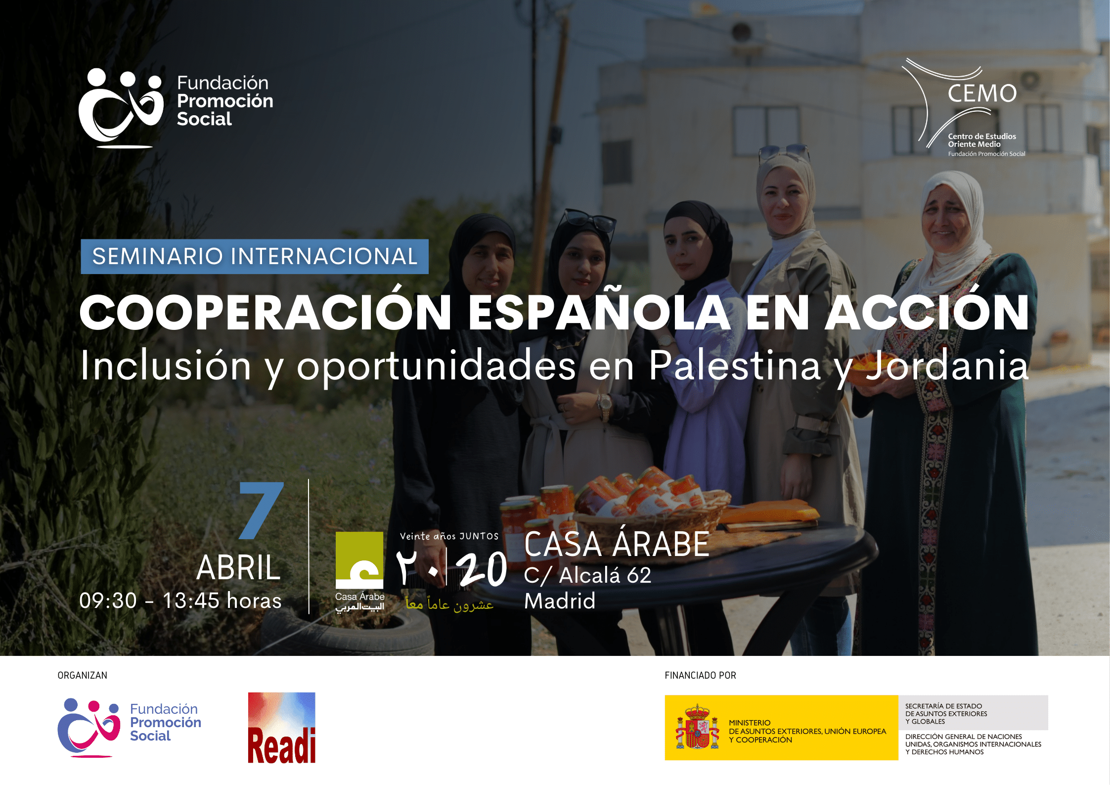 El evento está organizado por la Fundación Promoción Social y su Centro de Estudios de Oriente Medio (CEMO), en colaboración con la Red Euro-árabe de ONG para el Desarrollo y la Integración (READI) y cuenta con la financiación de la Secretaría de Estado de Asuntos Exteriores y Globales del Ministerio de Asuntos Exteriores, Unión Europea y Cooperación.